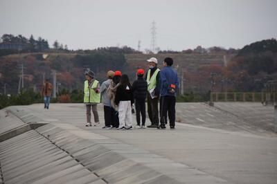 <防潮堤を歩きながら、津波についての話を聴きます>
