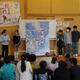 危険箇所や避難場所を書き込んだ大きな地図を前に、説明する子供たち。