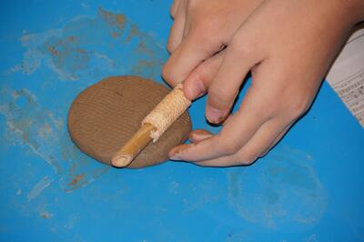 粘土をこねた後、縄目の模様を付け、「縄文」の由来を体験を通して学びました。