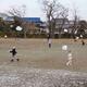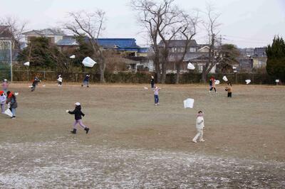 1年生が校庭で凧揚げをしていました。