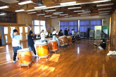 このところ、休み時間になると多目的室から太鼓の音が響き渡るようになっています。