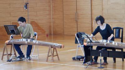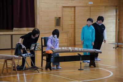また、3人の代表児童が箏をはじく体験もさせていただきました。
