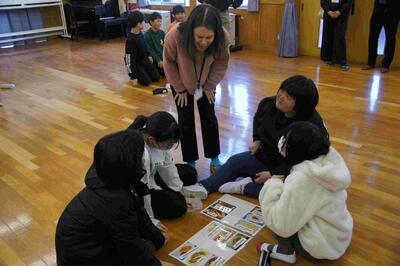 七ヶ浜の小学校とプリマスの小学校の様子が映像で紹介され、文化の違いに子どもたちからは何度も驚きの声があがっていました。最後は、プリマスで人気の食べ物の名前を当てるゲームで楽しみました。