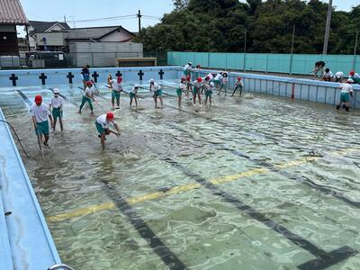 6月2日にプール清掃がありました。5,6年生がデッキブラシとたわしを持って一生懸命汚れを取ってくれました。1年間の汚れは手強く大変でしたが,きれいなプール槽になりました。