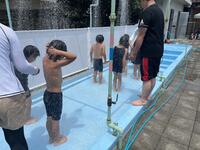 プールの授業が始まりました。十分に準備運動をした後は,シャワーを浴びます。