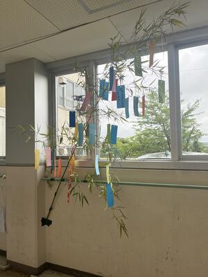 『警察官になれますように』『ロールケーキ屋さんになりたい』など、1年生の願い事が書かれた短冊が吊るしてあります。