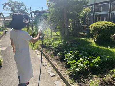 夏休み中は,3年生の水やり当番の子どもたちの代わりに,先生が水をあげています。