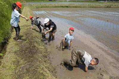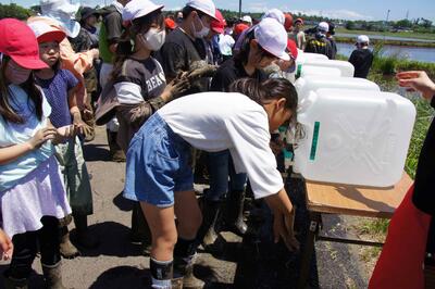 田んぼの持ち主の佐藤さんから植え方のレクチャーを受け、町の生涯学習課などの職員さん方にもお手伝いいただきました。転んで泥まみれになる子も続出しましたが、楽しく体験することができました。同じ田んぼの向こう側で体験していた汐見小の5年生も、負けず劣らず全身泥まみれでした。
