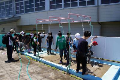 ”くつ洗い職人”が誕生!!水路から水を引く部分で、みんなの長靴やくつ下を次々に洗い、