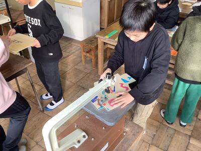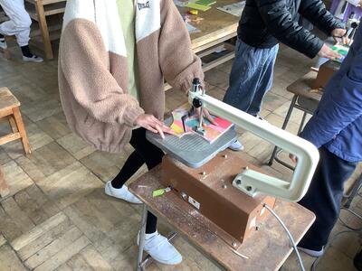 5年生の図画工作で,電動糸のこを使って作品を作っています。