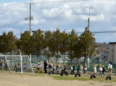 <入学式の翌日、校庭を散歩する1年生>